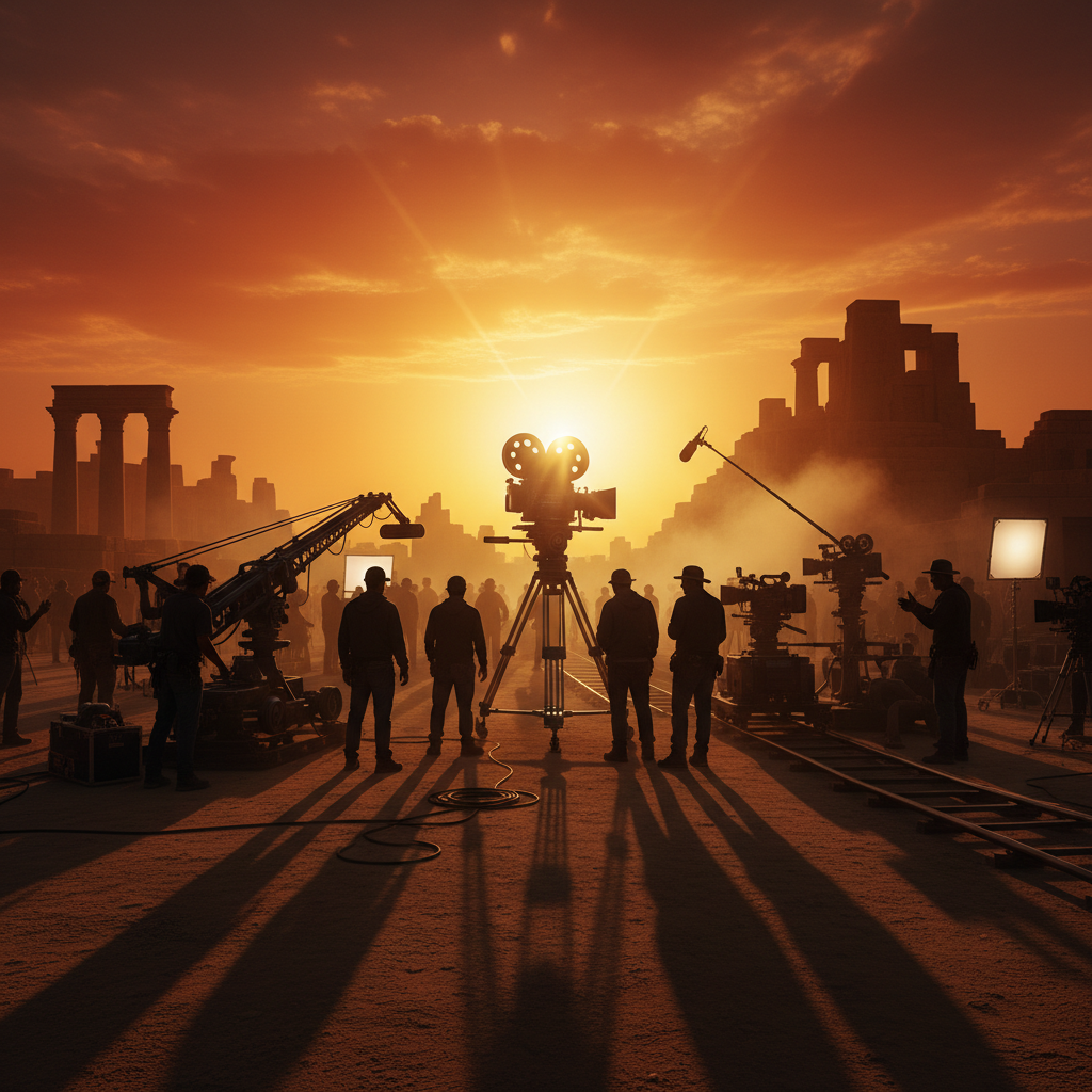 Cinematic Hollywood film set with dramatic lighting and camera equipment during production